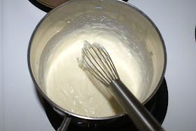 After a couple minutes, start slowly adding milk or cream.  What does "slowly" mean?  Add a bit of milk/cream (or broth, even, but you want a fatty broth-- the fats interact with the flour to thicken the sauce), then stir like crazy until the texture becomes uniform. Otherwise, you wind up with lumps, and it doesn't thicken as effectively.  Not the end of the world, but not ideal.  In the photo above, the mixture is almost ready to have more milk added.  (See how there's still a bit of unincorporated milk at the edges?)